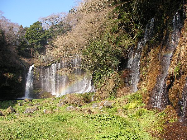 富士ICで高速を降り、富士山を時計回りで一周だ。途中、富士の観光ポイントとしてははずせない「白糸の滝」へ立ち寄った。雪解け水の水量も多く、立ち上がった水しぶきにきれいな虹がかかっていた。